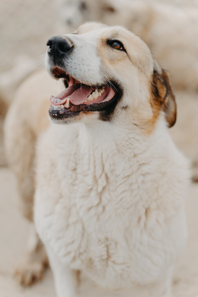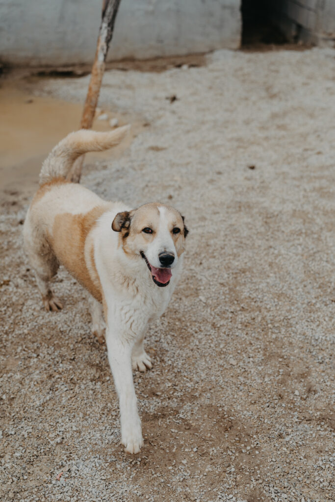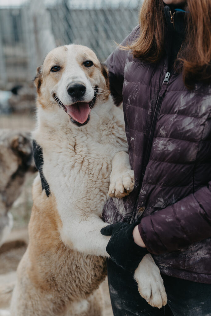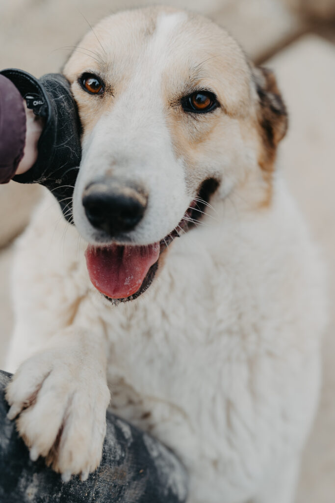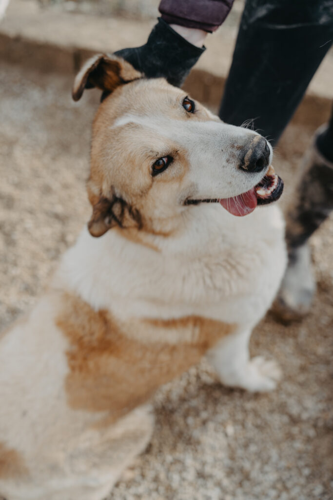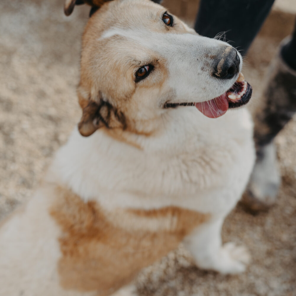 Leo kam 2022 als winziger Welpe zu uns und hat sich in jeder Hinsicht prächtig entwickelt. Mittlerweile kann ihn keiner übersehen. Langbeinig, gutmütig und entspannt, so zeigt er sich beim Fototermin. Mit seinen knapp 60 Zentimetern Schulterhöhe und seiner ebenmäßigen braun-weißen Zeichnung im Gesicht erinnert er ein wenig an einen Bernhardiner, bringt jedoch viel weniger Kilos auf die Waage und ist mit Sicherheit bewegungsfreudiger.