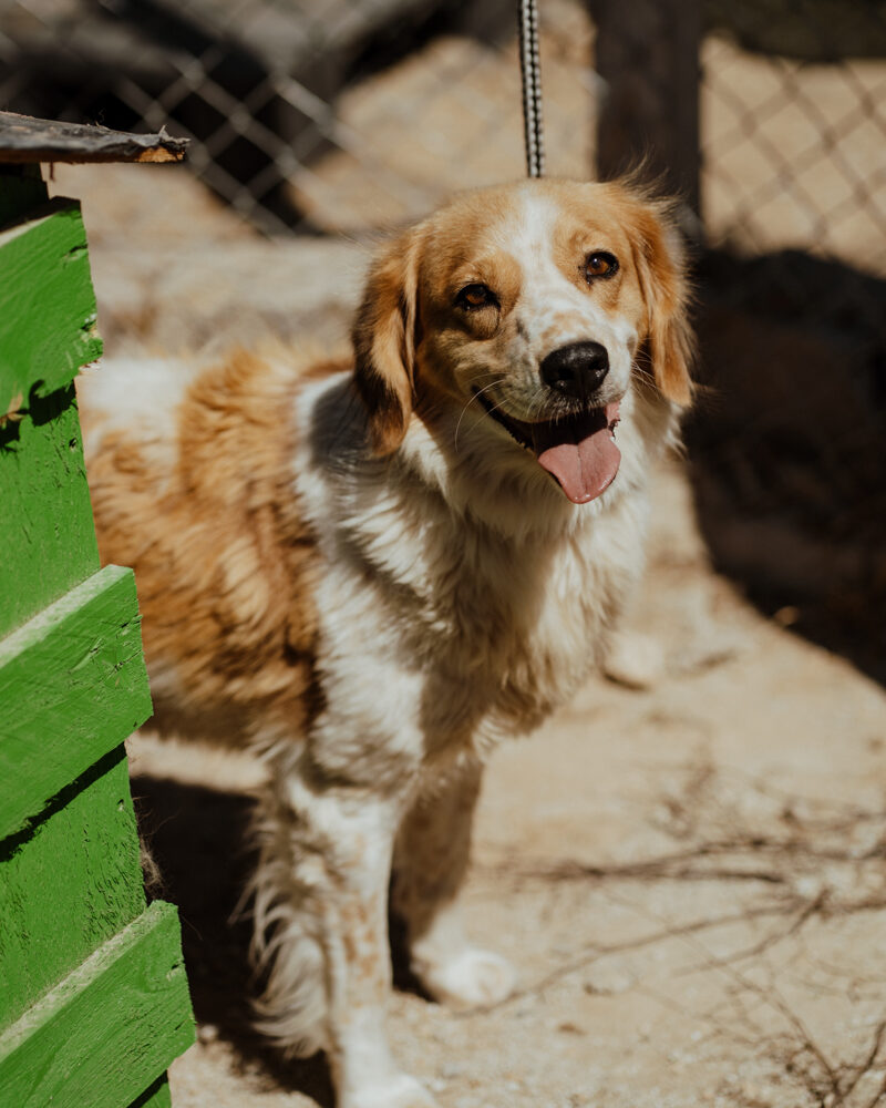 Dieser wunderschöne Spaniel Mix, geboren ungefähr 2022, lässt alle Herzen schmelzen. Zunächst begrüßt sie uns vom Dach ihrer grünen Hundehütte. Dann hüpft sie runter und lehnt sich sofort an unsere Beine, um Streicheleinheiten einzuheimsen. Und dann schaut sie uns mit ihren Mandelaugen direkt ins Gesicht und fragt uns: “Nimmst du mich mit?”.